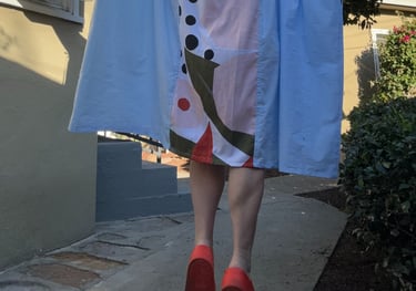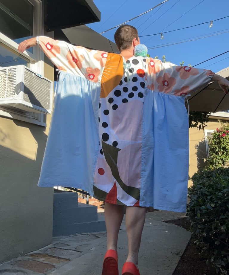 I have long admired Sue-Ching Lascelles and the amorphous, colorful, Marimekko inspired dresses she hand crafts. I decided to take on the giant effort of backwards engineering a dress in her likeness.