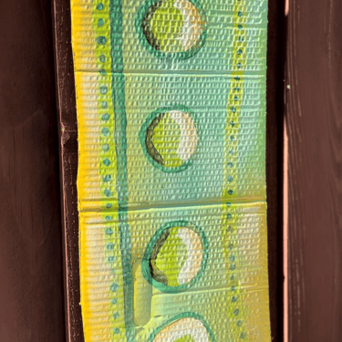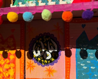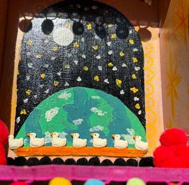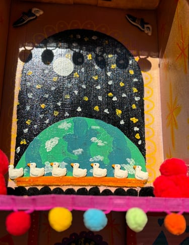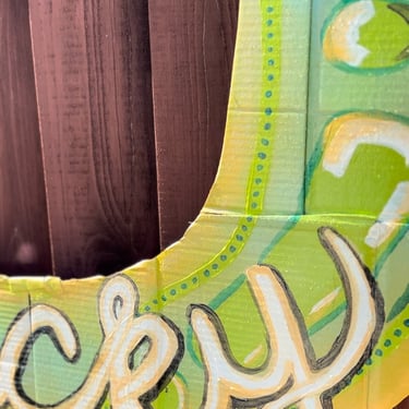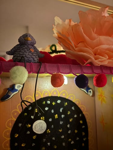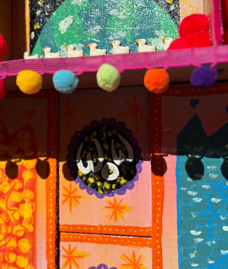 Mixed Media: Cardboard, acrylic paint, pom poms, ceramic findings, mod podge, pipe cleaners.