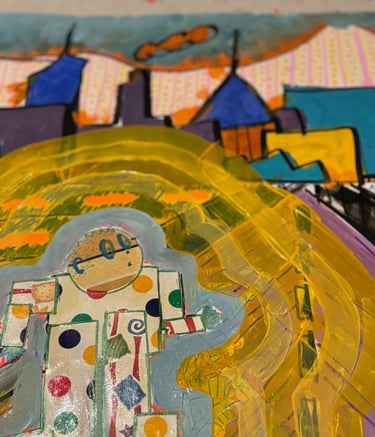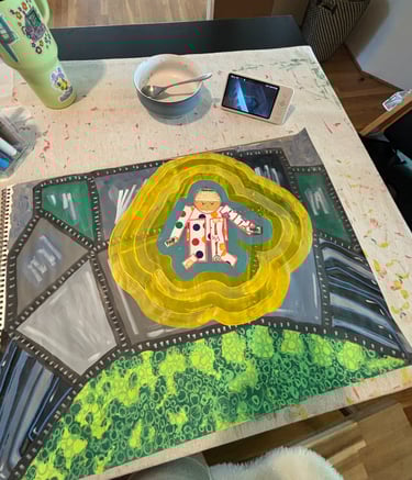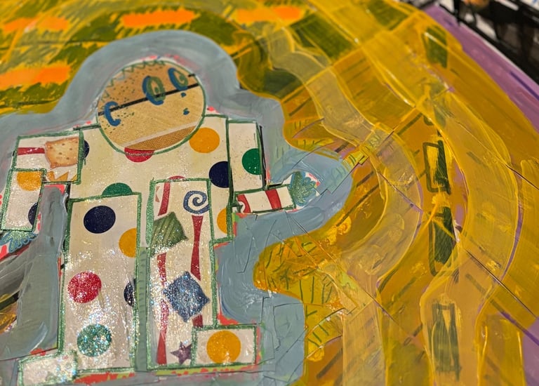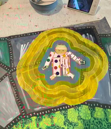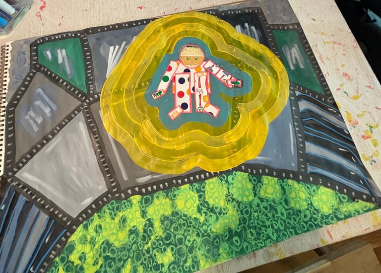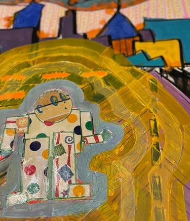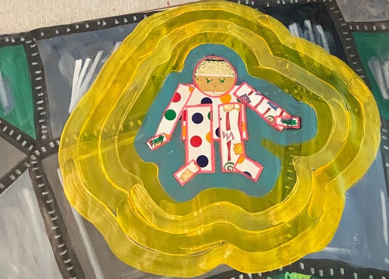 I experimented with mixing cut paper, mod podge, acrylic paints and posca markers when making this series. These were images from a dream that I had that hung over me for days.