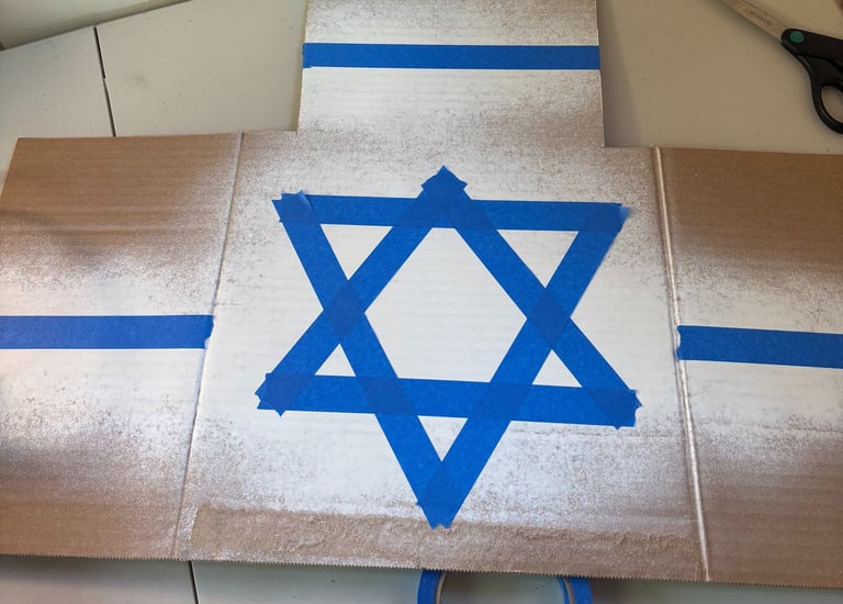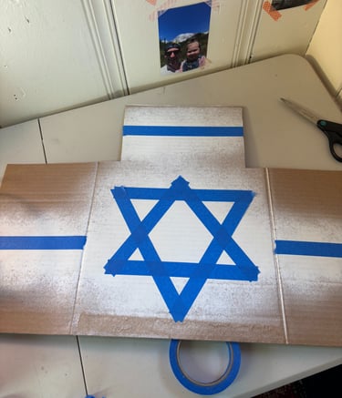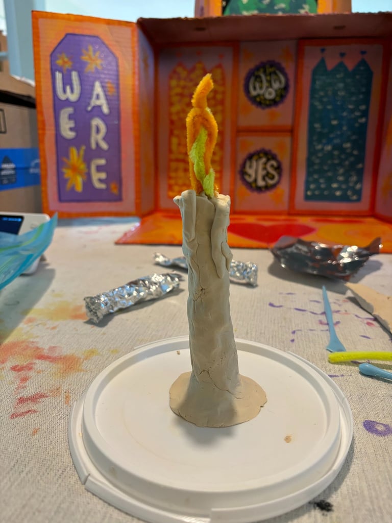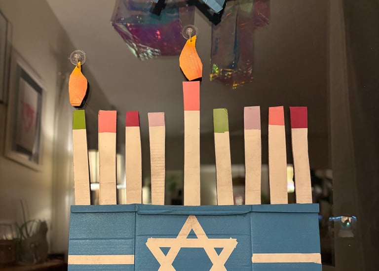 I made small flames to go over top each candle- one for each night of Hanukkah. I drilled a hole in the top and used a suction cup to hang them on the window.