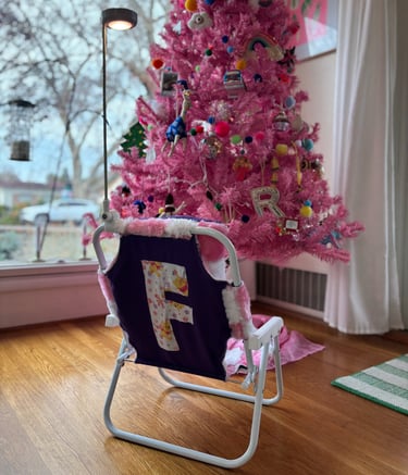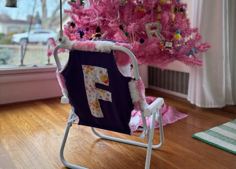 I measured, cut and sewed the fabric, and attached it to the kid's chair frame.