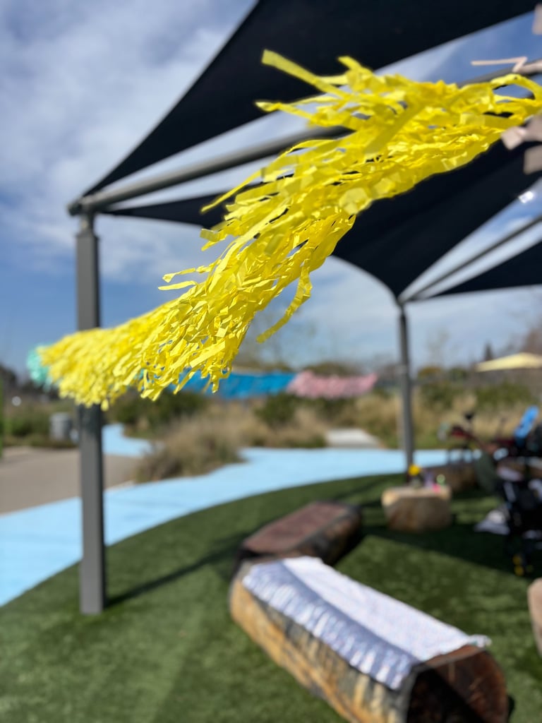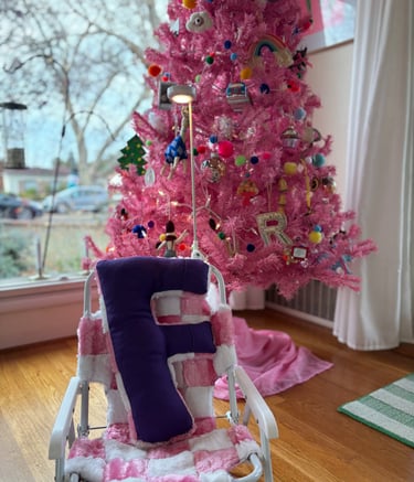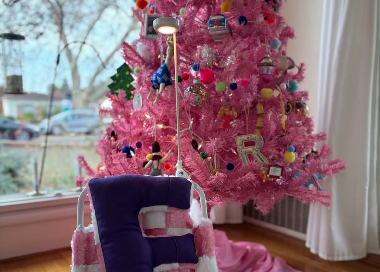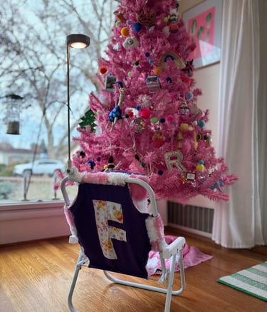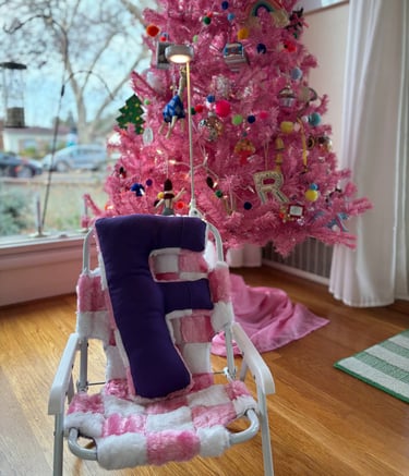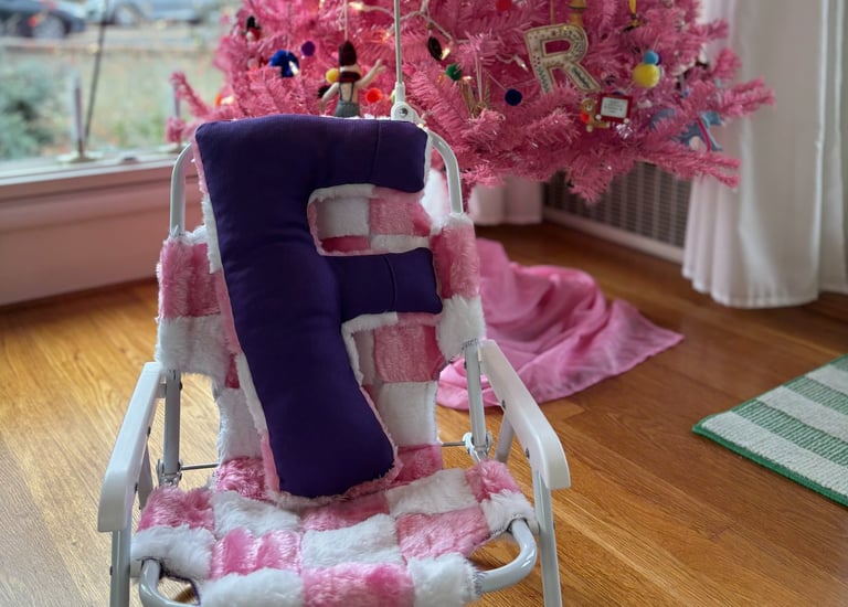 The F came together quickly and was stuffed ENTIRELY with pom pom scraps! I got a push light from Amazon, drilled a hole in it and hot glued it to a small bike flag pole and attached that to the chair- voila!